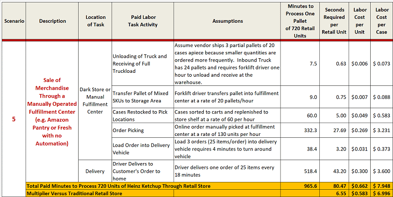 For each scenario we document the multiple paid labor processes involved within the supply chain including: receiving; restocking; picking; sorting/staging; shipping; and delivering the order to the consumer's home. This analysis calculates by process the paid labor requirements to move one pallet of Heinz ketchup to market so that we can understand the order of magnitude of labor requirements required for each scenario.